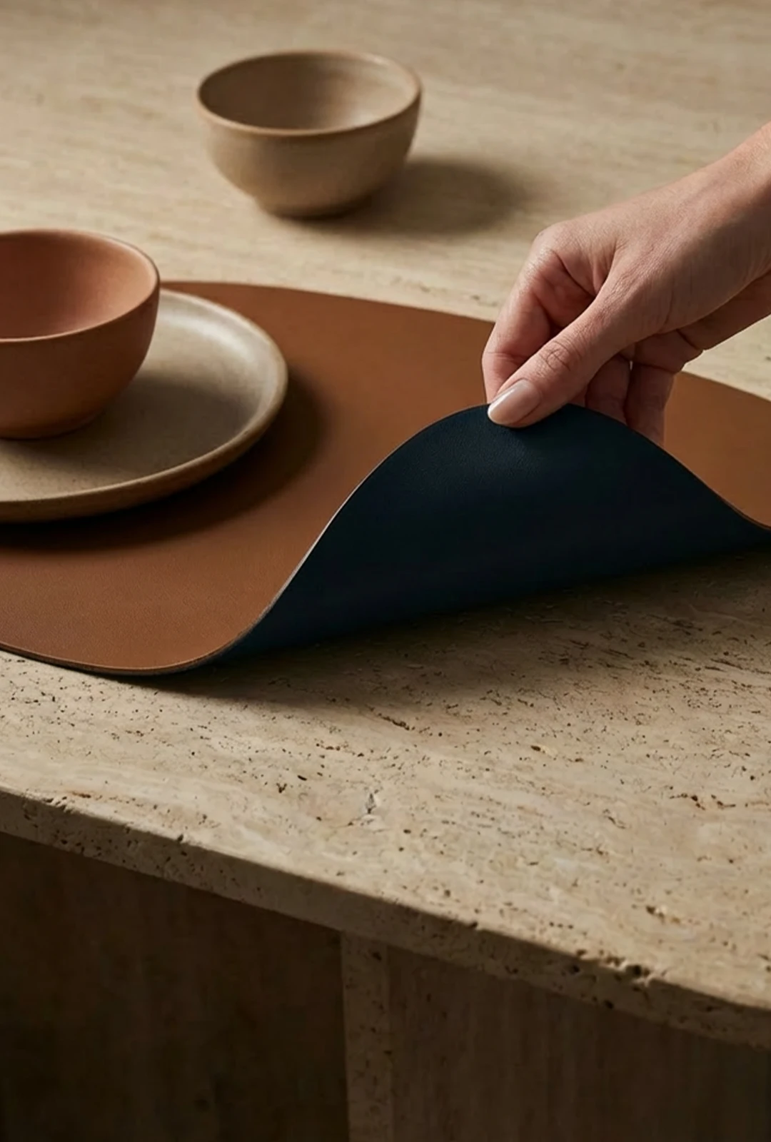 Das RIO 2er Set vereint kräftiges Toffee und tiefes Midnight in einem ruhigen Zusammenspiel. Zwei Tischsets, jeweils beidseitig nutzbar und in fein aufeinander abgestimmten Farbduos. Die sanft fließende Form, die Bewegung zulässt und zugleich Beständigkeit bewahrt, wirkt in der Zweier-Kombination besonders klar und ausbalanciert. Jedes Set entsteht aus hochwertigem bio-basiertem Traubenleder, das für seine Strapazierfähigkeit und seine exzellente Verarbeitung bekannt ist.