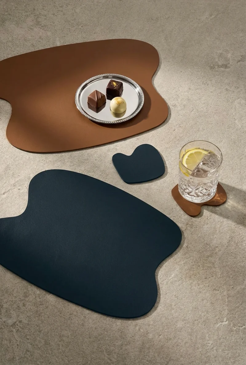 Die FORMA Serie verkörpert die Design-Philosophie von Studio Luy. Eine klare, organische Gestaltung trifft auf nachhaltige Materialien und sorgfältige Verarbeitung. Jedes Tischset ist mehr als nur eine Unterlage – es ist ein eigenständiges Objekt, geprägt von einer reduzierten Formensprache, einem präzisen Farbkonzept und einer spürbaren Qualität. Das Wendedesign, das stets zwei sorgfältig ausgewählte Nuancen in einem Stück vereint, eröffnet endlose Möglichkeiten, einen Esstisch neu zu inszenieren. Die FORMA Serie ist ein Statement für moderne Tischkultur, gefertigt aus bio-basiertem Traubenleder, das in Sachen Langlebigkeit und Haptik überzeugt.